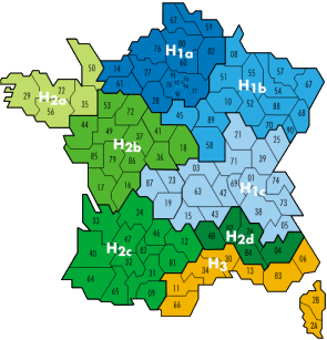 Les couleurs représentent les régions géographiques (au sens des réglementations thermiques) auxquelles le département est rattaché.
